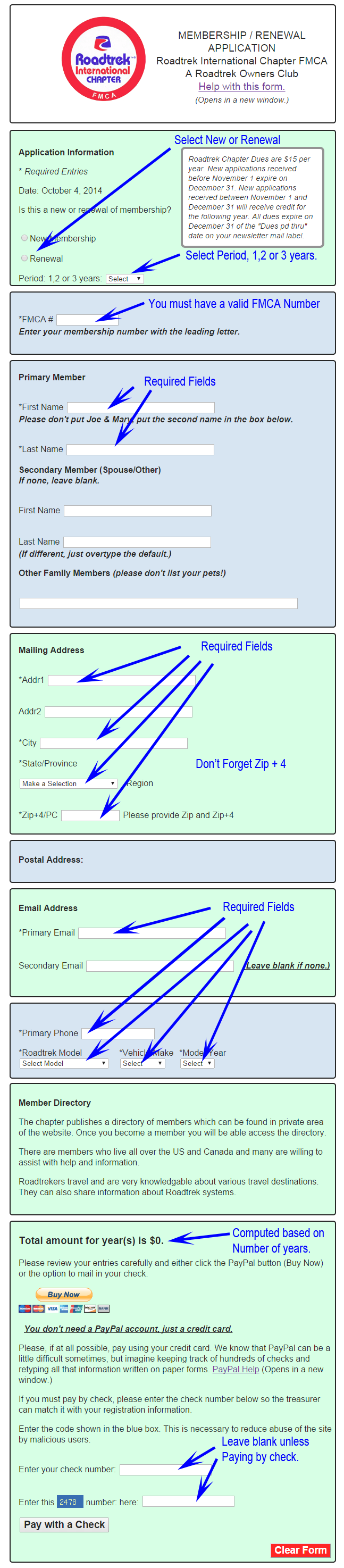 This form is smarter than most and it will detect some errors and missing information. It won't let you complete the process until you have entered the needed information. If you make an error or leave something out, the computer will display a message in Red Letters. Look for the error message for an explanation for why it's not working. A common error is not specifying the number of years you wish to renew. Another common error is not specifying if your information has changed. The chapter secretary will make note of this and update your information in his records.